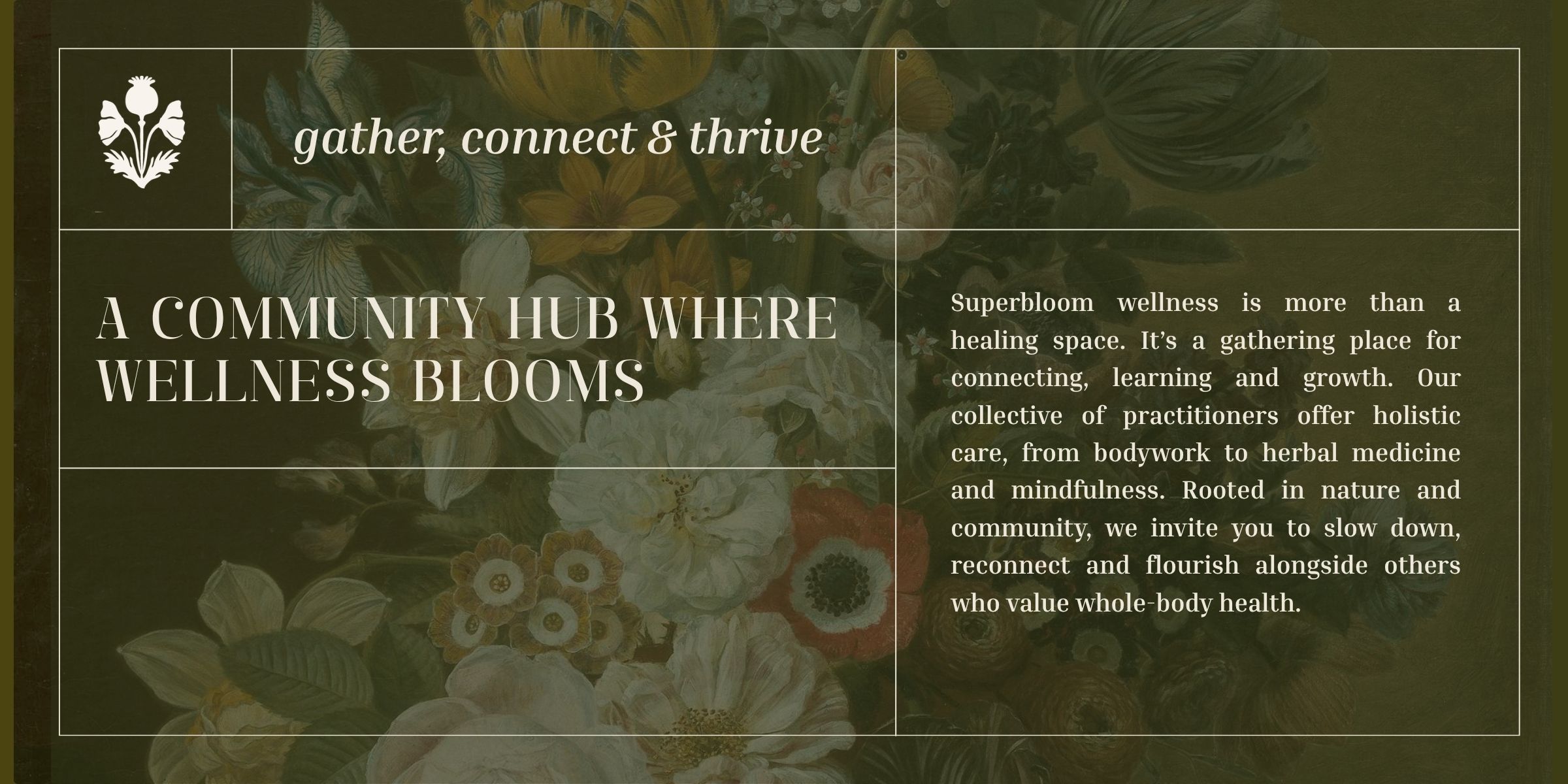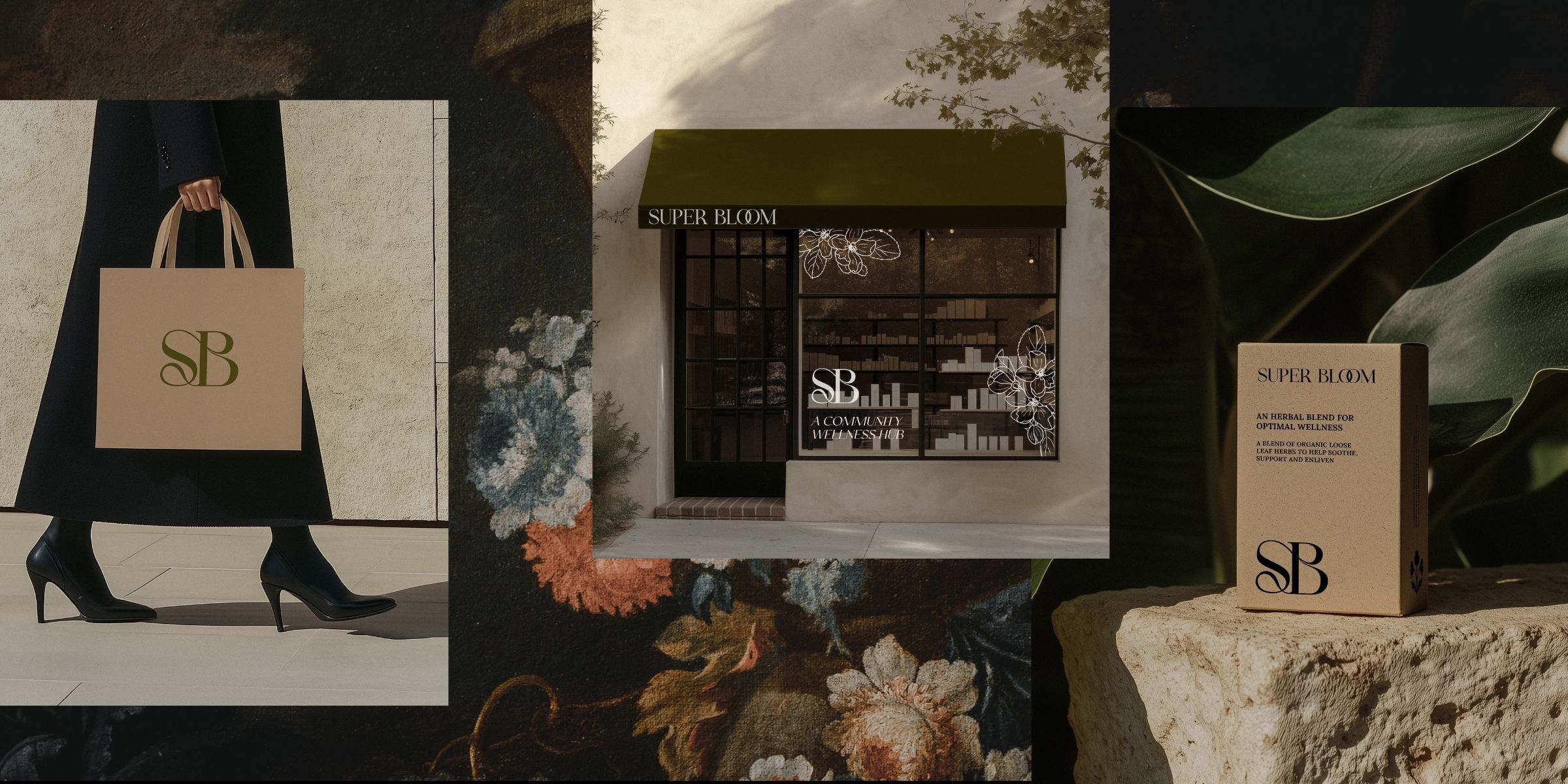 SuperBloom Wellness is a conceptual brand for a membership-based holistic wellness hub designed to support local practitioners and expand access to integrative care in a rural community. The challenge was to create an identity that bridges the earthy, botanical feel of an apothecary with a refined, modern aesthetic that feels both grounded and elevated, welcoming yet professional, and capable of scaling into a larger wellness network.